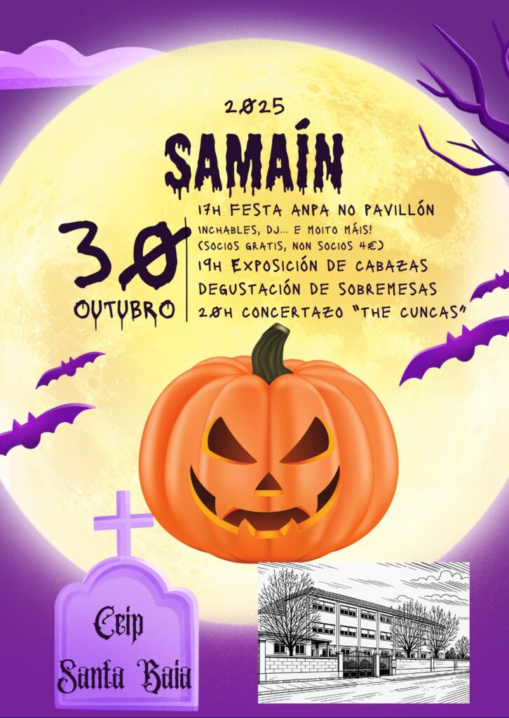 O próximo 30 de outubro celebramos o Samaín no CEIP Santa Baia! Nos días previos nas aulas falaremos desta festividade e realizaremos actividades para que o alumnado coñeza esta parte da tradición