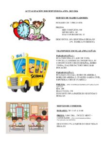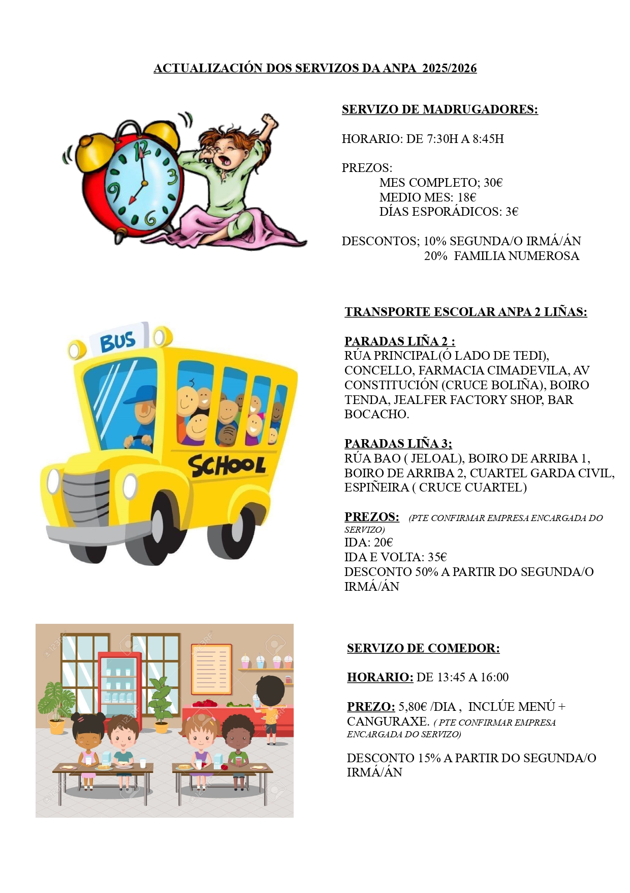 | Madrugadores, Comedor, 2 liñas de transporte e Extraescolares. |
